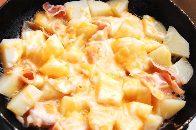 じゃがいも、ベーコン、とけるチーズ。この3つの組み合わせは、“間違いなくおいしい“鉄板トリオ。そこで本日は、この鉄板トリオを使った、YouTubeチャンネル『くまの限界食堂』の「カリホクジャーマンポテト」を作ることに。ベーコンを炒めた後、水にさらしたじゃがいもを水ごと加えて煮込み、水がなくなったらチーズを加え、カリッと焼き上げるというもの。じゃがいもにはベーコンの旨味がしみしみだとか♪