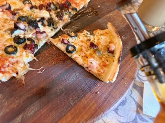 オリーブとタコがたっぷりのっていて、おいしい~!(外食のピッツアでよくある、具が少ない物とは全然違います!)タコ、ぷりぷりで、塩味が効いています。 ピッツア生地は薄く、カリカリ!ブッタネスカとはアンチョビ、ケッパー、オリーブのトマトソース。ガーリックも効いていて、深みがある味わい。