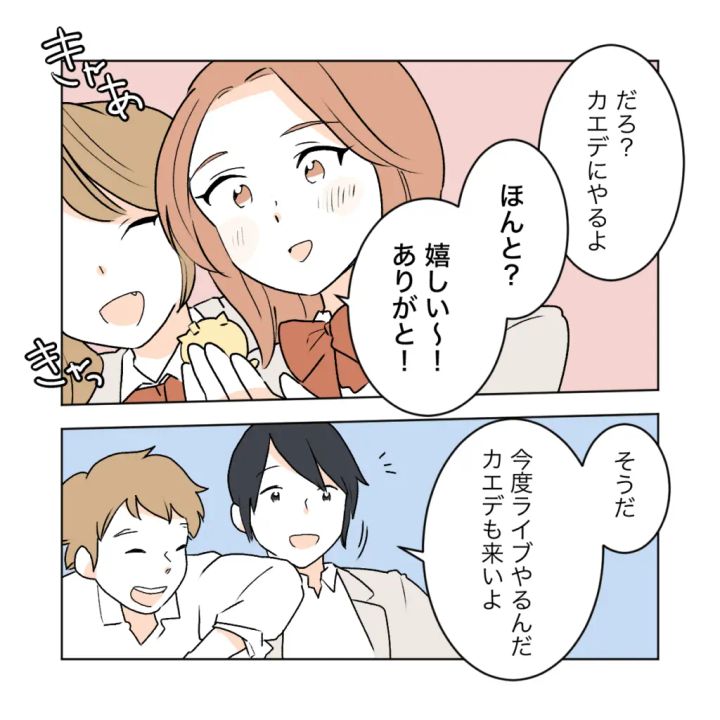 男子からの人気も抜群のカエデは、クレーンゲームのぬいぐるみを取ってきた男子に「カエデのとこの猫に似てね?カエデにやるよ」と言われて「ほんと?嬉しい~!ありがと!」と素直にお礼を言って無邪気に喜ぶタイプ。他の男子たちに「今度ライブやるんだ。カエデも来いよ」と誘われると