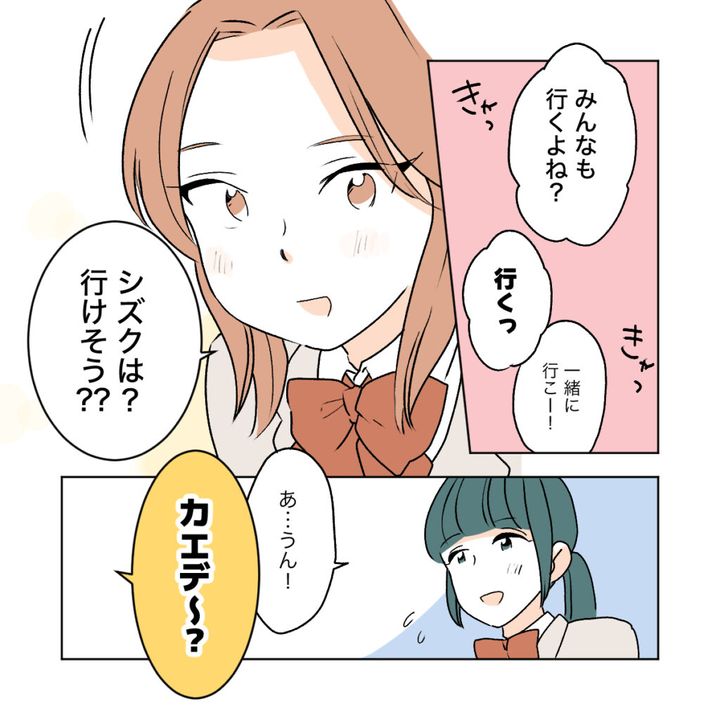 カエデは女子からも人気でした。「みんなも行くよね?」と声をかけられた女子たちは「行くっ」「一緒に行こう!」といつものように明るいカエデを中心にきゃっきゃと盛り上がります。「シズクは?行けそう?」と言われた私も嬉しくて、「あ・・・うん!」とこたえました。そこへ、また別の「カエデ~?」と呼ぶ男子の声。