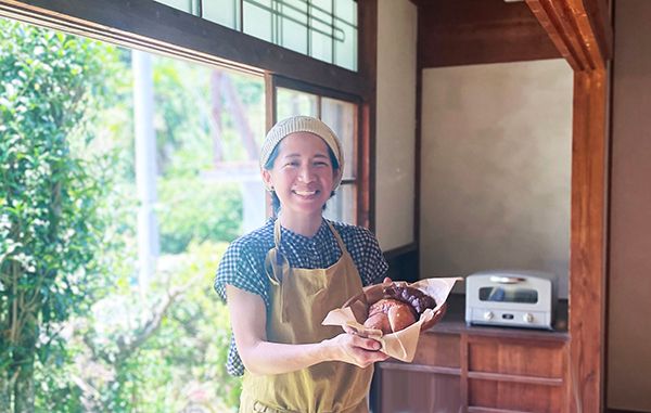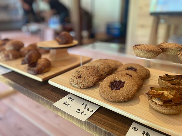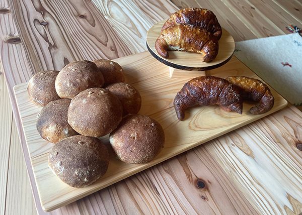 店主は久万高原町山暮らし15年の木嵜真衣子さん。豊かな自然が育んだ素材をふんだんに使い、手間を惜しまず発酵、酵母、麹、菌の力でおいしくやさしくカラダが喜ぶパンやお菓子を作られています。 地元のものを使うのは食材だけではありません。古民家を改修したお店づくりにも、久万高原町の杉が構造材として使われているなど、どこまでも地元愛にあふれるお店です。