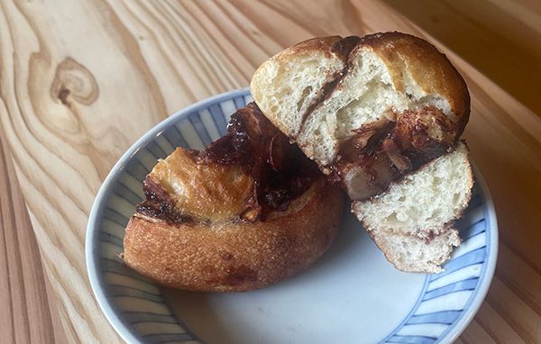 「カカオロールパン」は、オーガニックカカオシュガーで巻き巻きしたチョコ味のパン。内子町の全粒小麦を石臼で挽いて天然酵母、グラスフェッドバターを使用するこだわりよう。1個200円。