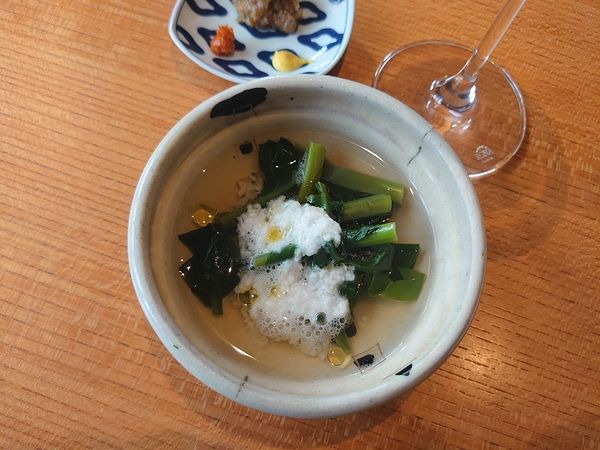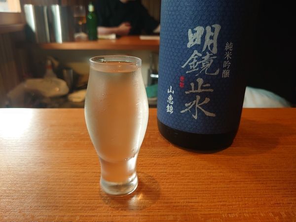 王道の日本酒もあったのでオーダー。この日は「光栄菊」と「明鏡止水」の2本で、ネーミングが涼しげな後者をチョイス。