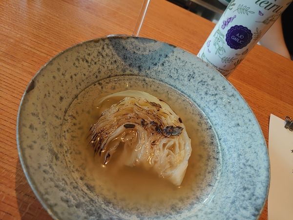 とても柔らかく、箸で簡単に切れます。半分ほど食べたタイミングで、店員さんがガーリックオリーブオイルをお好みで足してくれます。これにより、風味がぐっと深まり、さらに食欲をそそる一品に。
