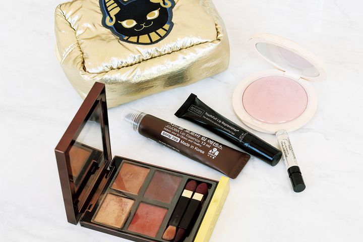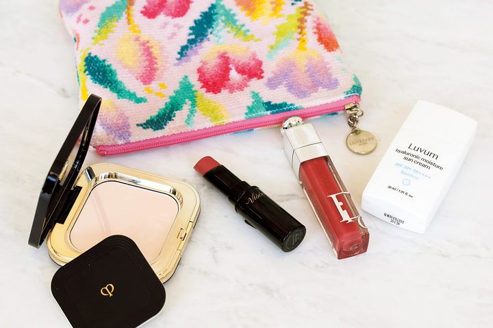 自身が開発したBBクリーム、AMYUのエデュケートBは塗り直しても厚塗りにならず、メイク直後のような仕上がりに。エルメスのネイル&キューティクルオイルやレプリカのハンドクリームでハンドケアもしっかり。リップは3本、アホ毛スティックも持ち歩いて細部まで抜かりなく。