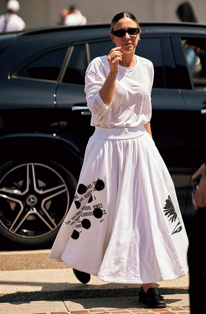 スカート選びは、リゾートではなく、オケージョン寄りのドレッシーな方向に振るのも手。カジュアルなトップスとのミックスマッチが新鮮に映ります。