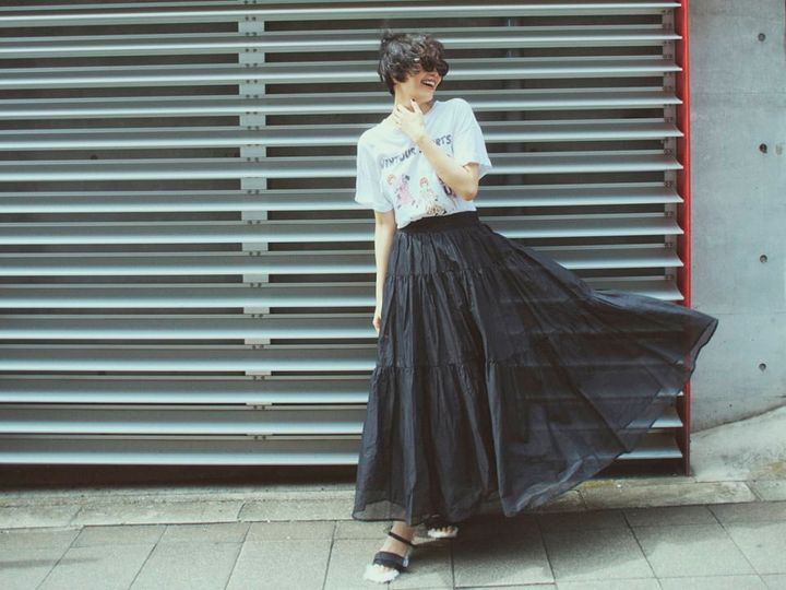 大人の体型に実はサマになるのが、ニュアンスたっぷりのボリュームスカート。デザイン性控えめで甘過ぎないタイプを選んで、Tシャツの新たな相棒に♡