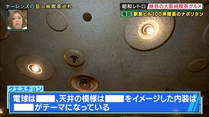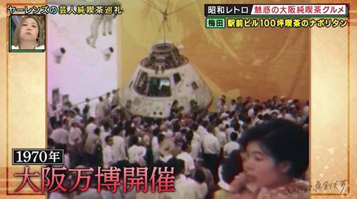 トキがヤーレンズに、「僕が世界一落ち着く喫茶店。唯一無二の内装をヤーレンズにも一度は見てほしい!」とおすすめしたのは、梅田の大阪駅前第1ビル地下1階にある喫茶店マヅラ。1946年に梅田で創業したマヅラが、大阪駅前第1ビルに移転したのは1970年だ。1970年の一大ニュースといえば、大阪万博の開催。万博で月の石が展示されたことによって、当時大阪の人々は宇宙への関心が高まった。