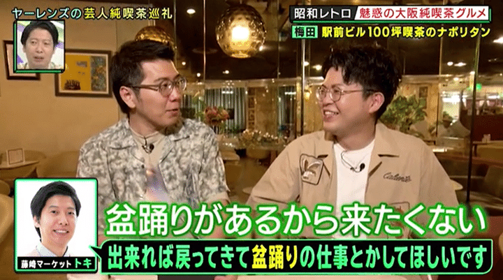 自家焙煎のコーヒーと昔ながらのナポリタンを味わうヤーレンズに、トキからメッセージが。気になるその内容は、「今では『M-1』ファイナリストとなった2人ですが、大阪に戻ってくるという選択肢はありますか? できれば戻ってきて盆踊りの仕事とかしてほしいです」。トキはスタジオでも、VTRのヤーレンズに向かって「戻ってくれよ~!」「やってくれよ~ぜひ~!」と必死に呼びかけた。