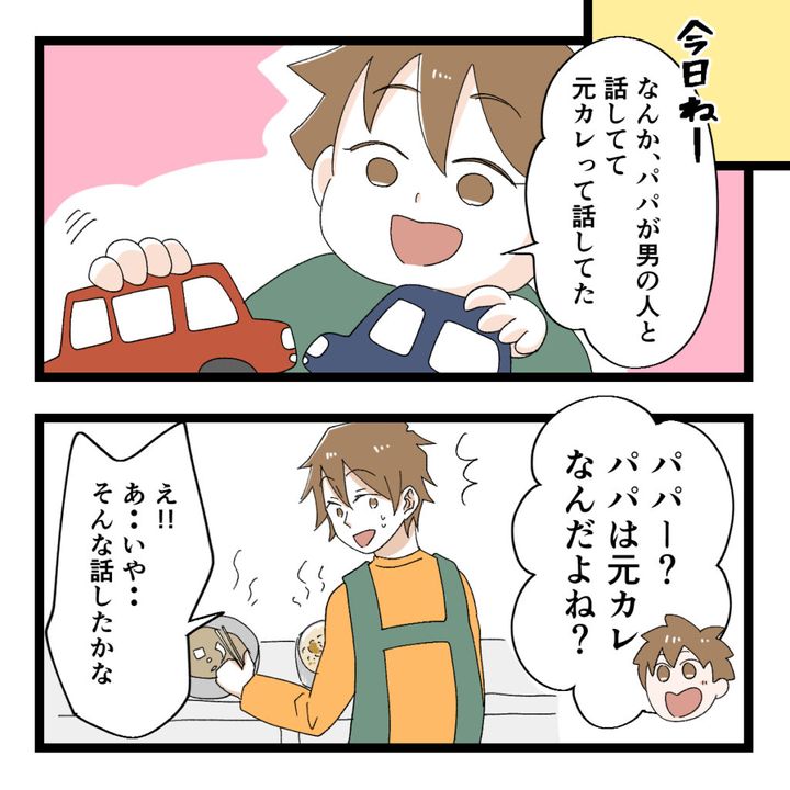 帰宅後、ヒロトさんが夜ご飯の準備をしていると、ソウくんが「今日ねー。なんか、パパが男の人と話してて元カレって話してた」とアユミさんに話し、「パパー?パパは元カレなんだよね?」と無邪気に聞きました。ヒロトさんは「え!!あ・・いや・・そんな話したかな」としどろもどろ。