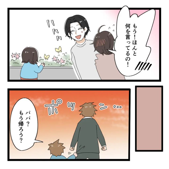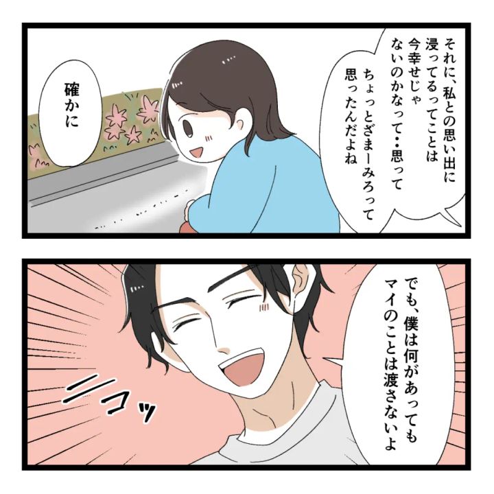 3年同棲して結婚の話しもしていたのに、浮気相手のアユミさんとの子どもができ、マイさんを捨ててアユミさんとの結婚を選んだヒロトさん。その後、マイさんは誠実でイケメンな男性カイさんと出会い結婚し、子どもも生まれ幸せな毎日を送っていました。一方のヒロトさんはアユミさんが家事育児に積極的ではないため仕事、家事、育児に追われる毎日で疲弊していき夫婦仲も円満とは言えず、「マイと結婚していたら」とマイさんのことを度々思い出していました。時が経ち、ヒロトさんは幸せそうなマイさん家族を道で見かけました。その後、息子のソウくんのお迎えの帰りにマイさん親子を見かけたヒロトさんは、マイさんが泣いていると勘違いして勝手に夫婦仲が良くないと思い込み「俺が力になる」「別れたことを後悔していた」などと言い出します。ヒロトさんの思い込みの激しさに恐怖を感じてマイさんが戸惑っていると、カイさんが気づいて駆けつけました。カイさんがマイさんを悲しませていると思い込んでいるヒロトさんは「元カレです。あなたのところへは行かせられません」と勘違い発言。カイさんはマイさんとの仲の良さを見せつけると笑顔でマイさんと子どもを連れて立ち去りました。ポツンと残されたヒロトさんは呆然。帰り道、「私と結婚してたらって言い出してすごく怖かった」と言うマイさんに、カイさんは「僕も・・」と口を開きました。