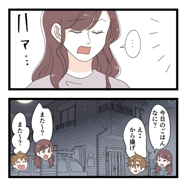 アユミさんは無言で大きな溜息をつくと、ソウくんが言ったことには触れず「今日のごはん何?」とヒロトさんに聞きました。ヒロトさんが「え・・から揚げ」と答えると、アユミさんは不満そうに「また~?」とポツリ。それを真似してソウくんも「また~?」と言いました。