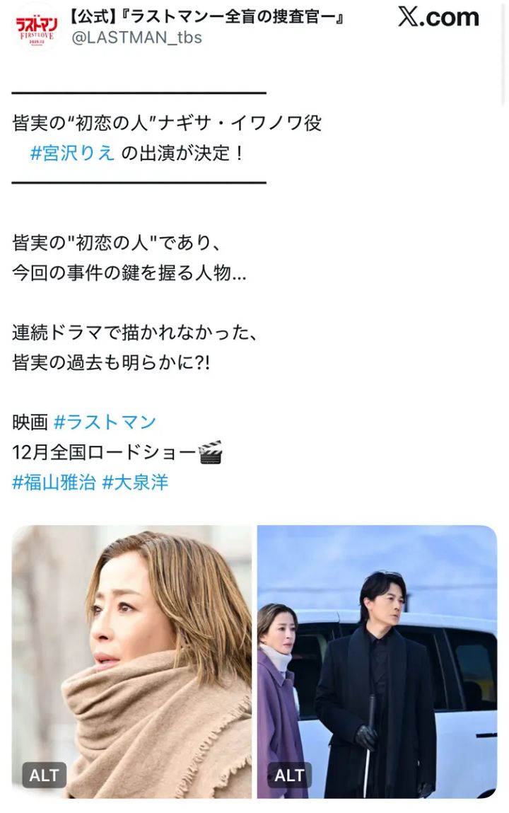女優の宮沢りえさんが、12月公開予定の映画『映画ラストマン -FIRST LOVE-』に出演することが9月17日に発表され、その役どころとビジュアルが大きな話題となっています。