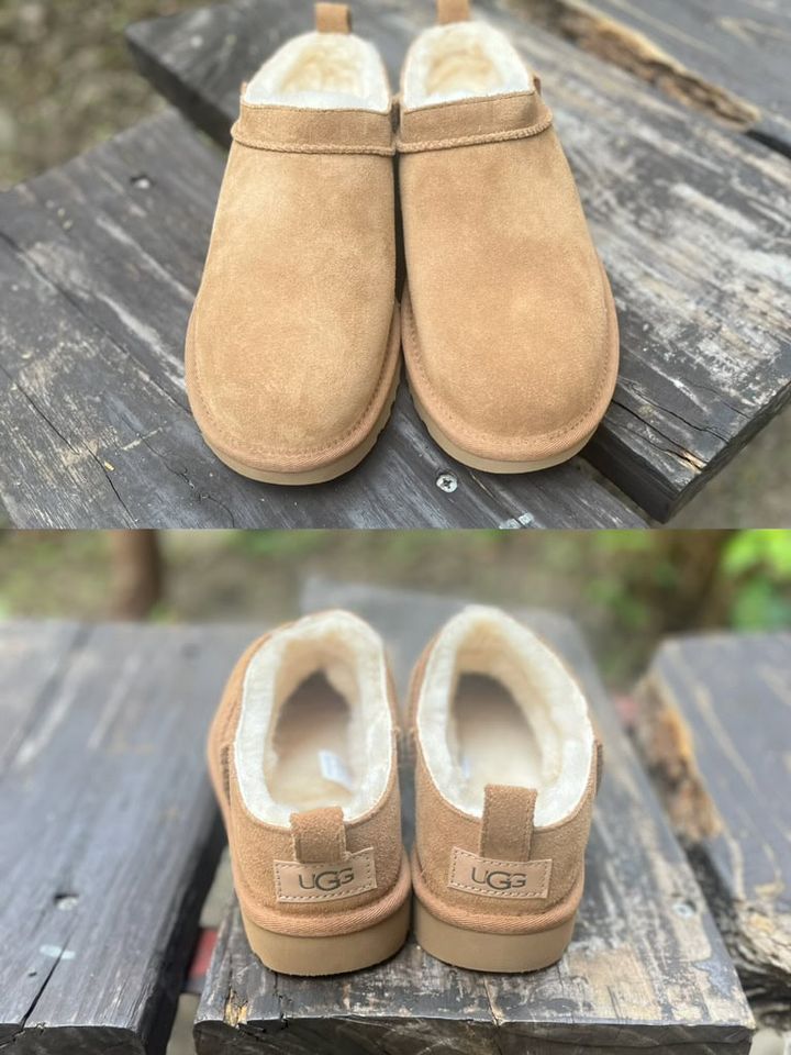 【アグ】といえば厚底が人気ですが、この秋冬はローヒールのバリエーションも充実。「引き続きロープロファイルがトレンドということもあり、今シーズンはアグもローヒールをプッシュしています。なかでもオススメなのが、新作のクラシック マイクロ。脱ぎはきがラクなローカットデザインになっていて、さらにかかとをステップダウンしてはくことができるんです。軽い撥水加工が施されていたり、サトウキビ由来の軽量EVA のアウトソールを使用するなど、地球環境に配慮されているところも見逃せません」(工藤さん)