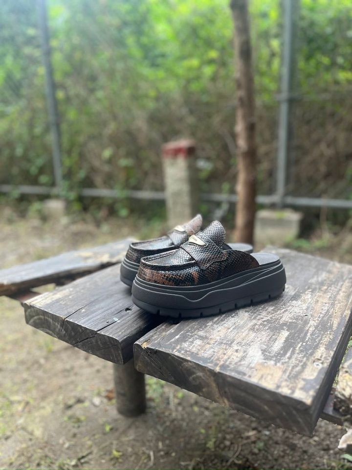 クラシックなローファーとリラックス感あるミュールをドッキングさせた本作。「今年の干支にちなんだワイルドなスネーク柄が採用されています。しかもブラウン系というのもポイントで、色でも旬を意識した1足になっています。重厚感ある見た目ですが驚くほど軽く、はき心地はストレスフリー。大胆なプラットフォームソールとのコンビネーションも印象的で、スタイルアップが叶うのもうれしいところ。素足ではいたりソックスと合わせたり、さまざまなスタイリングが楽しめるのも魅力ですね」(工藤さん)