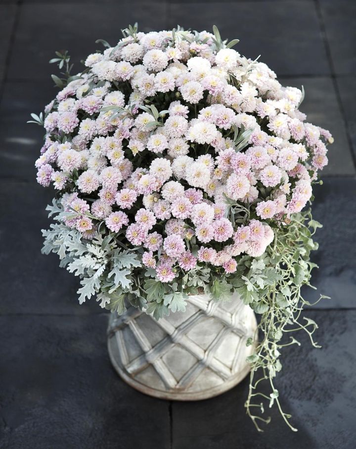 【ピンクのマムの寄せ植え①】パステルピンクの花の脇役は銀葉に統一