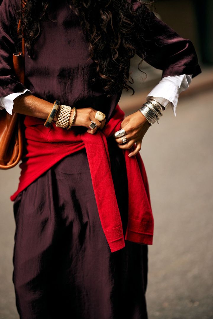 シンプルなベーシックスタイルに鮮烈なカラーを加えることも、“ドーパミンドレッシング”を体現する今季らしいテクニック。とりわけニューヨークでは、レッドが人気のアクセントカラーとして注目されていた。