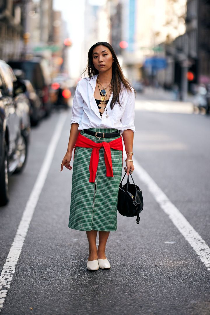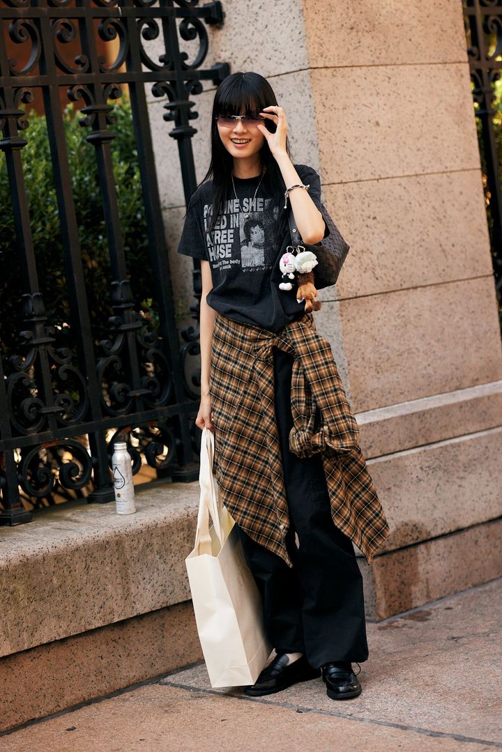 もちろん、クロエCHLOÉ)の「パディントン」や、ミュウミュウMIU MIU)のローファーブーツといったアイコニックなアイテムを合わせれば理想的。けれどこの腰巻きスタイルの魅力は、高価な小物に頼らなくても成立する点にある。ベーシックなクルーネックやチェックシャツさえあれば十分。ヴィンテージショップでも見つかる、等身大のテクニックなのだ。