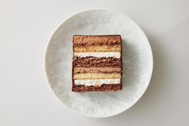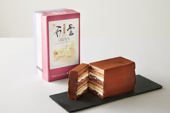 島原半島のシンボルともいえる雲仙岳のふもとに佇むお菓子屋さん「ネオクラシク クローバー」のチョコレートケーキは、全国からお取り寄せオーダーが絶えない、長崎を代表する銘菓。日本中から選りすぐりの銘菓が揃う第4回ニッポン全国おやつランキング(2013年)ではグランプリを獲得、その後、全国区のテレビ番組や雑誌などのメディアでも紹介され絶賛された実績も。洋菓子のはじまりの地ともいわれる長崎の石畳をイメージしたケーキの味わいは、濃厚でありながらも甘さが上品で後を引くおいしさ。ベルギー産ミルクチョコをはじめ、純正クリーム、カカオスポンジ、バニラスポンジを8層に重ね合わせ、生チョコでコーティングし、さらにカカオをあしらったスペシャル仕様。石畳をイメージした〝映える〟断面も魅力です。いざフォークを刺すと、とにかくふわふわで軽やか。 口どけのいいコーティングの生チョコ、重なり合うクリームに2色のスポンジ、そしてチョコレート…口の中でとろけながら絶妙に混ざり合う食感は唯一無二。チョコレート好きにはたまらない逸品です。