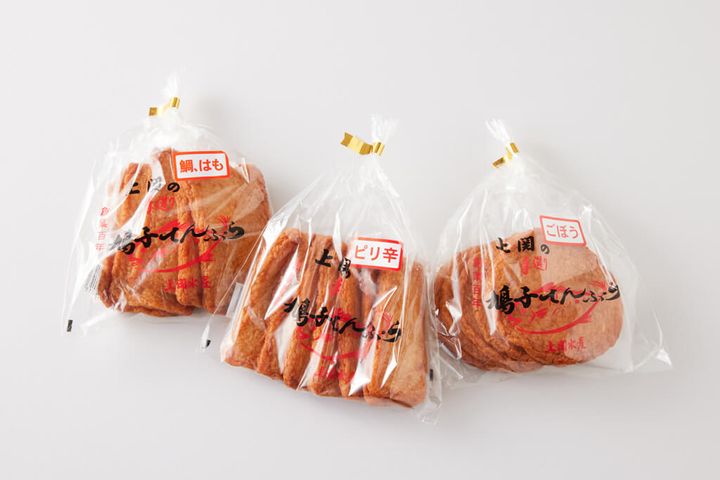 元祖の味である「ごぼう」。一味唐辛子を加えてスパイシーに仕上げた「ピリ辛」。通常のすり身に鯛とはもを加えた「鯛はも」の3種類に加え、ミニサイズやスティック状のてんぷらも販売されています。
