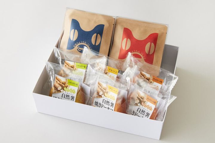 コーヒー豆のような形をしたつぶらな目のパッケージが愛らしい「金魚ちょうちんブレンド」と、“自然薯栽培発祥の地”と呼ばれる柳井市の自然薯をたっぷり使った「自然薯焼きドーナツ」の組み合わせ。どちらも地域ブランド「きんさい柳井」認証品で、柳井市のしあわせギフト工房まつもとのオリジナルセットです。