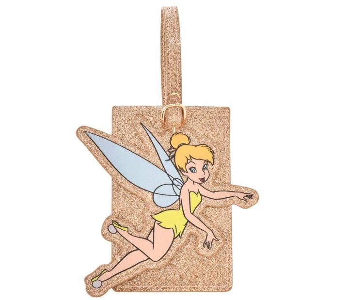 ティンカー・ベルのダイカットモチーフが配された「ラゲッジタグ」2900円。ストラップまでラメがきらめき、かわいさ抜群。シックなデザインのスーツケースとの相性もバッチリ!