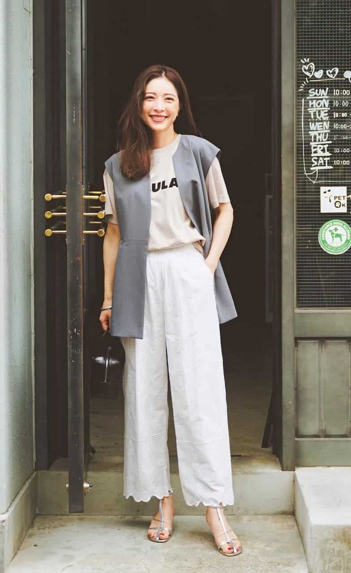 パンツ¥4,980(ベベッド)ジレ¥19,910(ハッシュニュアンス)Tシャツ¥13,200(カデュネ)バッグ¥82,500(メゾン カナウ/ヤマニ)シューズ¥17,050(ダイアナ/ダイアナ 銀座本店)ブレスレット¥37,400(ニナ・エ・ジュール/ショールーム ロイト)