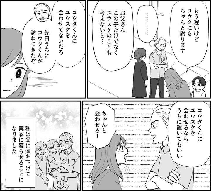 私は父に頭を下げて、実家に暮らせることになりました。お給料は相変わらずで、その半分を家に入れているけれど、生活はだいぶラクになって精神的な余裕も生まれたのです。そして父との約束通り、ユウスケをコウタや義両親に会わせることになりました。