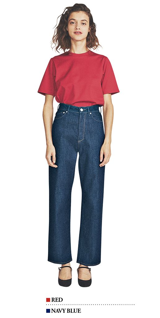 TシャツなのにLADYにふるまえる、濃度のある赤。色で飾り気を補えるため、濃紺デニム+Tシャツもメンズっぽく傾かない。