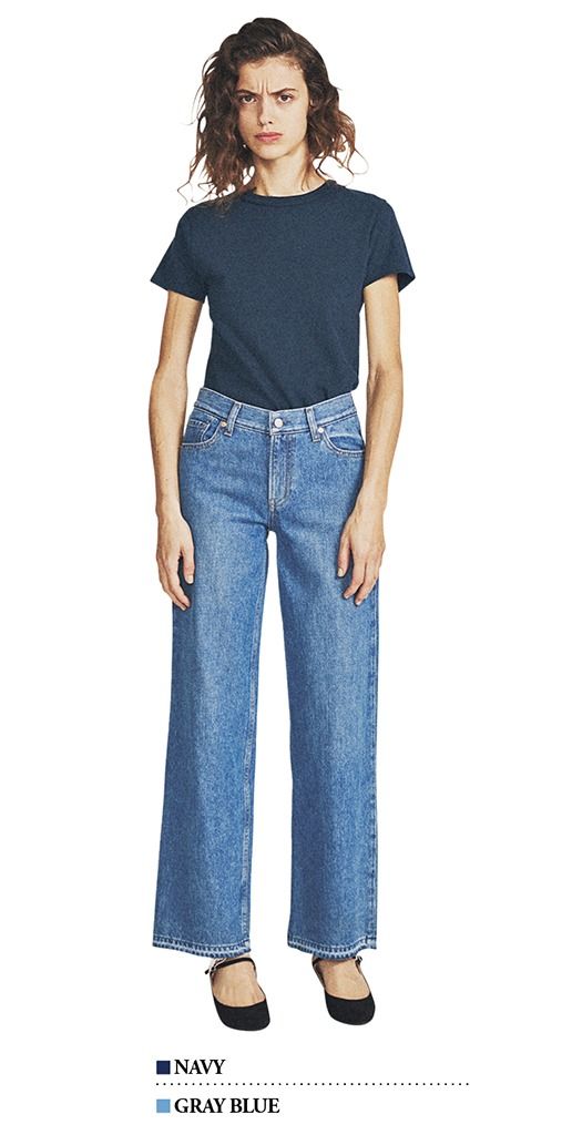 コンパクトな形のTシャツを選び、ネイビーをさらに品よく。デニムと同系色でそろえたことにより、縦のラインが引き立ち、シャープな見た目に。