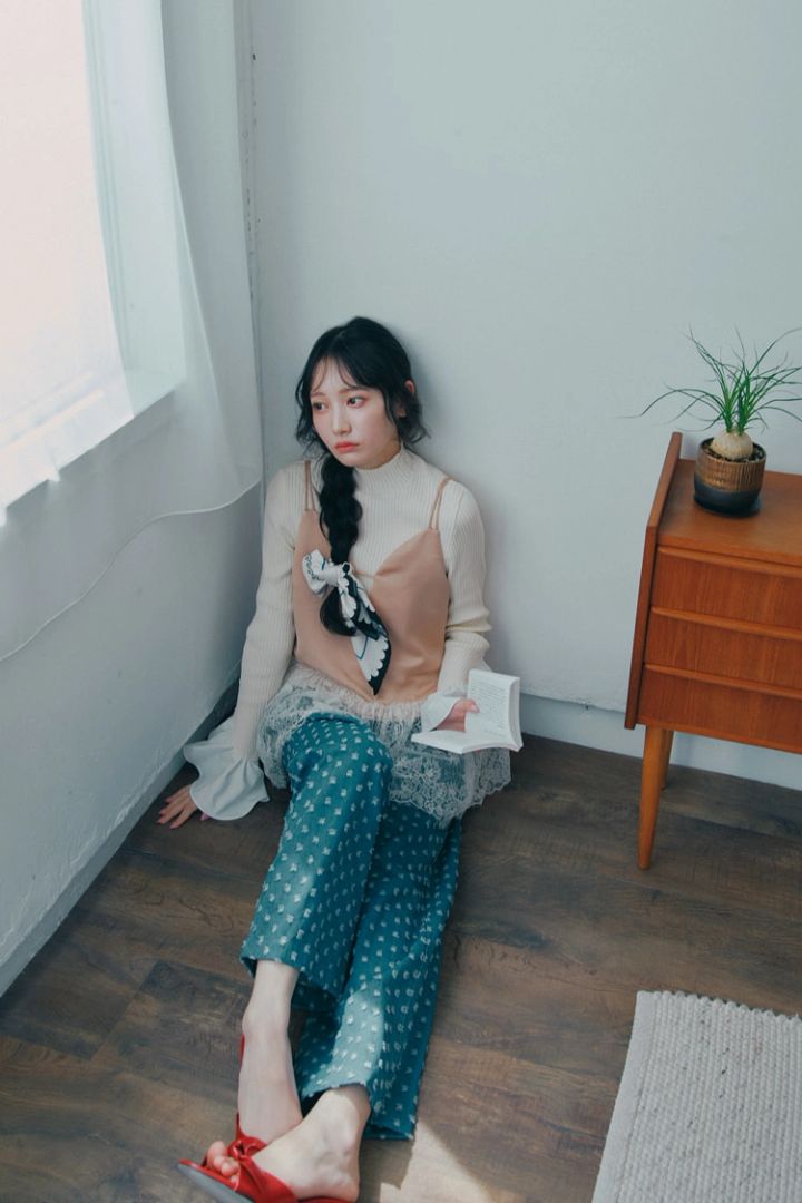 フリルそでニット 20,900円、サテンレースキャミソール 24,200円/ともにmasaco ter anishi(アプレドゥマン)デニムパンツ 4,290円/神戸レタス スカーフ 28,600円/GUNIA PROJECT(H3O ファッションビュロー)赤ミュール 8,990円/MANGO
