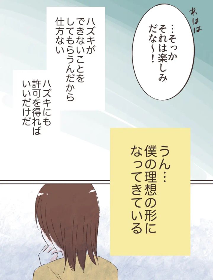 「・・そっか。それは楽しみだな~!」ユウコが提案した生活を想像してみると、なんだかとても楽しみになった。ハズキは嫌がるかもしれない。でも、ハズキができないことをしてもらうんだから仕方ない。ハズキにも許可を得ればいいだけだ。こうして僕はハズキにもしっかりと許可を取った上で今まで通りユウコにも家にいてもらう生活を手に入れた。うん・・僕の理想の形になってきている。僕は今のこの生活にとても満足しています。