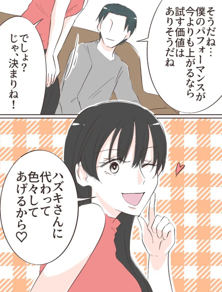 「そうだね・・。僕のパフォーマンスが今よりも上がるなら試す価値はありそうだね」そう答えると、ユウコは嬉しそうに「でしょ?じゃ、決まりね!」と言って「ハズキさんに代わって色々してあげるから!」とウィンクしました。