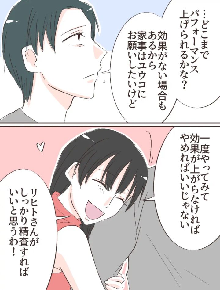 「・・どこまでパフォーマンスが上げられるかな?効果がない場合もあるから家事はユウコにお願いしたいけど」ユウコの提案にすぐにOKを出せずにいると「一度やってみて効果が上がらなければやめればいいじゃない。リヒトさんがしっかり精査すればいいと思うわ!」とユウコに言われ、それもそうだなと思えました。