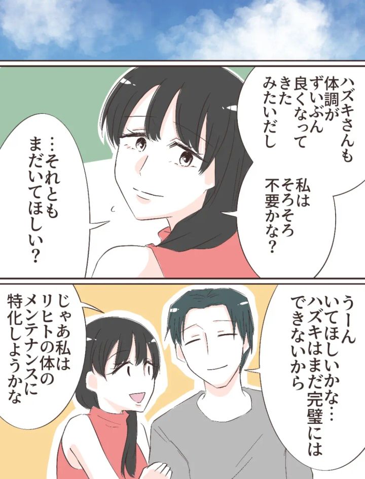 入院したハズキの代わりに家事をしてもらうために雇ったユウコですが、完璧に家事をこなし僕のサポートもしっかりしてくれるユウコとの生活はとても快適で楽しいものでした。ある日「ハズキさんも体調がずいぶん良くなってきたみたいだし、私はそろそろ不要かな?・・それともまだいてほしい?」とユウコに聞かれた僕は「うーん、いてほしいかな・・。ハズキはまだ完璧にはできないから」と答えました。するとユウコが「じゃあ私はリヒトの体のメンテナンスに特化しようかな」と言ったのです。