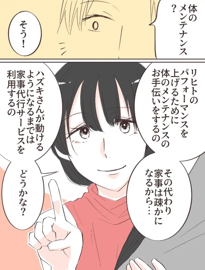 「体のメンテナンス?」ユウコの言っている意味がよく分からず聞き返すと、「そう!リヒトのパフォーマンスを上げるために体のメンテナンスのお手伝いをするの。その代わり家事は疎かになるから・・ハズキさんが動けるようになるまでは家事代行サービスを利用するの。どうかな?」とユウコが言いました。
