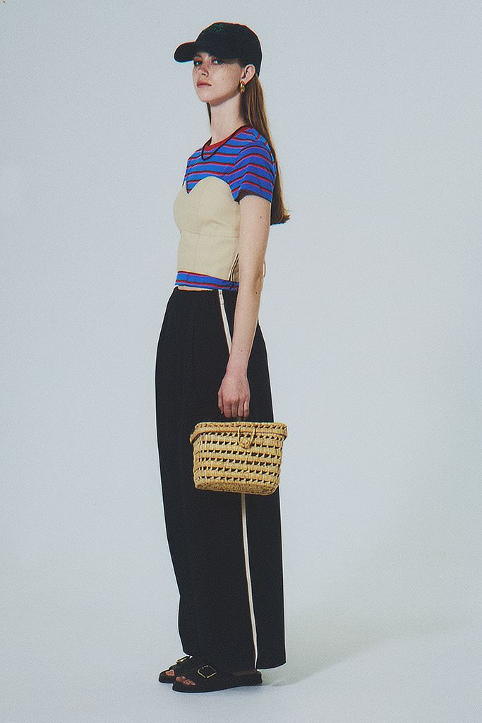 ビスチェは着まわし。ボーダーTシャツ/Gap トラックパンツ/Ungrid キャップ/Oblada(シンチ) ピアス/ココシュニック オンキッチュ(ココシュニック) ネックレス/ete バッグ/ケッシュ ル エッセンシャル(ザ エディット ストア) サンダル/モリーニ(ジャック・オブ・オール・トレーズ プレスルーム)