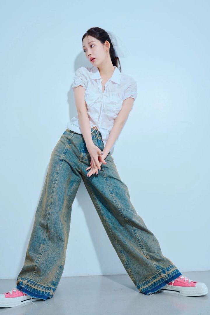 ややギャルみのあるデニムはとことんワイドなシルエットがミソ。トップスは抜け感のあるコンパクトなサイズを選べば、メリハリが生まれて即しゃれる。