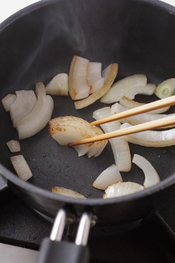 おいしさの秘密は、煮る前に玉ねぎをこんがりと焼きつけること。このひと手間で、玉ねぎ本来の甘みがぐっと引き出され、香ばしい風味が加わります。あまり長く焼くと食感がわるくなるので、断面に焼き色がついたらOKです。