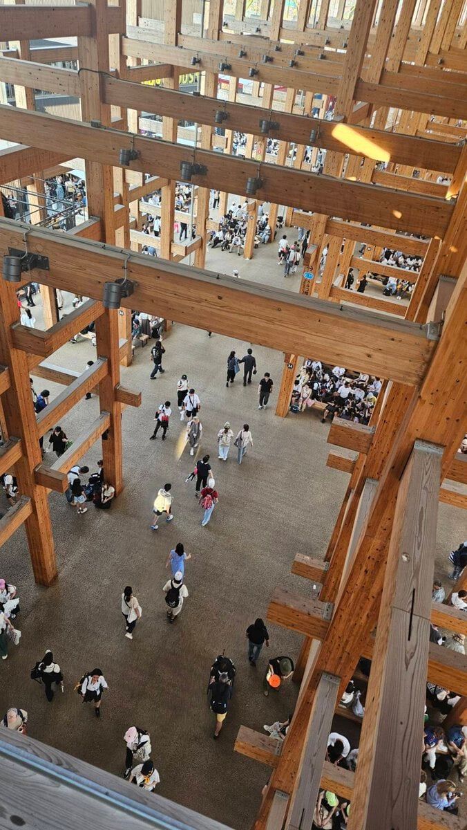 「大屋根の下は涼しいらしいよ」などと聞きますが、吹き抜けですし、日中は暑いです。日陰なだけマシかな、ぐらい。椅子は人で埋まってます。みーんな休憩してます。でも、夕方から急に涼しく、快適に! 10月が来たら日中でも過ごしやすくなりそうですね。