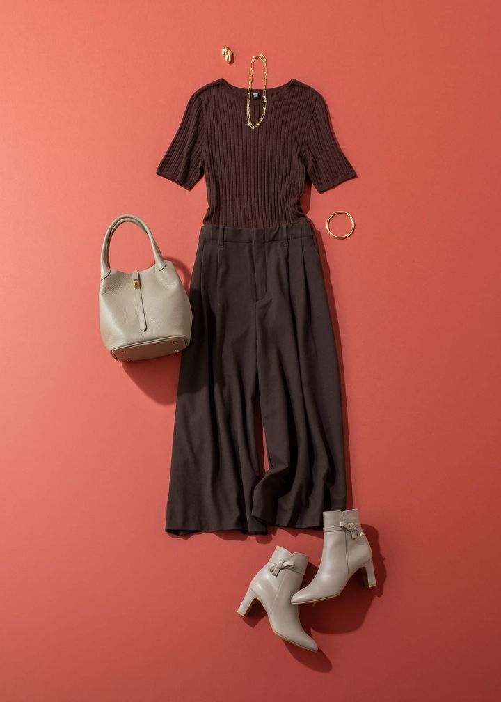 ダークトーンでまとめた統一感のあるスタイリングは、落ち着いて品のある印象になります。フィット感のあるトップスとワイドパンツが好バランス。ベージュやゴールドの小物で明るさをプラスし、よりスタイリッシュに仕上げて。