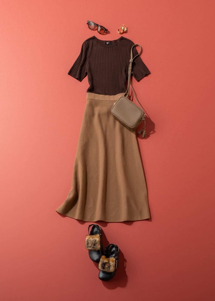 オールブラウンのコーデも、色のトーンや質感を変えるとこなれた雰囲気になります。サングラスやファーサンダルなどエッジの効いた小物で甘辛バランスを微調整し、ほっこり見えを回避。