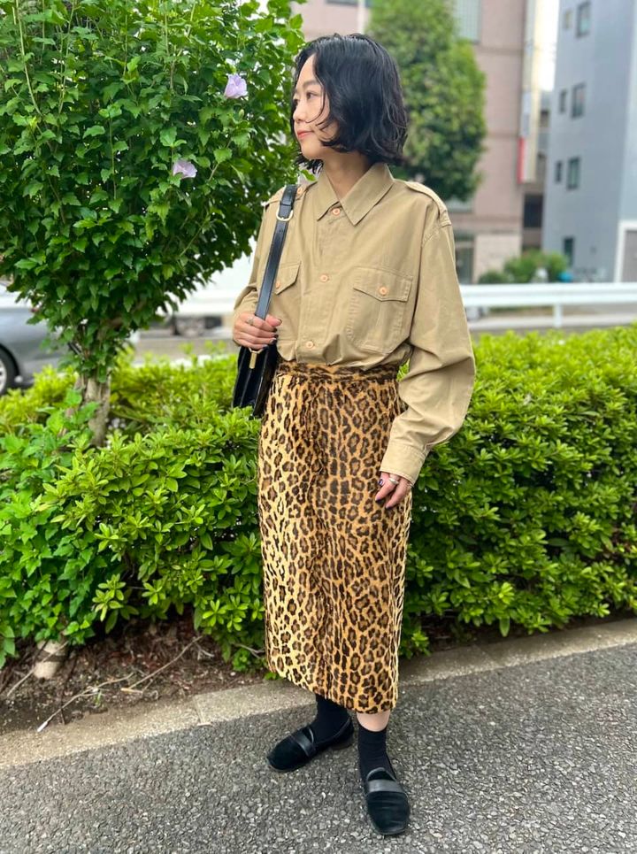 「80年代のフェイクファースカートがポイントです。ヴィンテージにありがちな重さも無く、コットン混の軽い毛並みが初秋からもはきやすい素材感。目を惹くレオパード柄でなら、一気に秋冬気分のコーディネートになるのでお気に入りです」スカート¥16,940(ヴィンテージ/ヘリコニア)