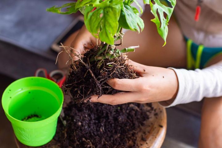 また、スパティフィラムのように株がふえていくタイプの植物は、株分けすることで同じサイズやさらに小さな鉢に植え替えられます。鉢から抜いた株を株元でいくつかに分けて、新しい用土で植えつけ。水をたっぷり与えて、1週間~10日ほどは日陰で養生します。