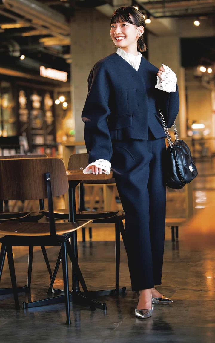 ネイビーセットアップでも丸いフォルムで堅さを払拭。ジャケットを肩掛けにハイウエストのバレルシルエットで脚長効果を狙って。 差し色で緩急をつければモード感が加速。