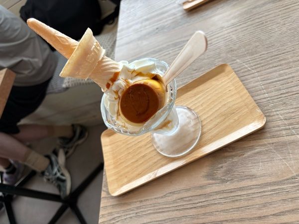 プリンソフト。牛乳ソフトクリームに、たまご風味たっぷりの手作りプリンにキャラメルソースがかかっている。