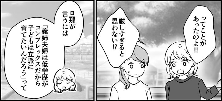 私はハルカ(33)。小1の息子がいて、同い年の子どもを持つユリ(32)とママ友になりしばらくたちました。今日までは子育ての価値観が似ていると思っていたので、ユリとは居心地良く過ごせていました。厳しすぎる親も叱らなすぎる親も、一緒に遊ぶとモヤッとすることがよくあるからです。しかし、すごくうれしそうに義姉のことを悪く言い、正義感に燃えるように「子どもが可哀想だ」と言うユリに……今日はじめて共感ができませんでした。むしろゾッとしたのです。