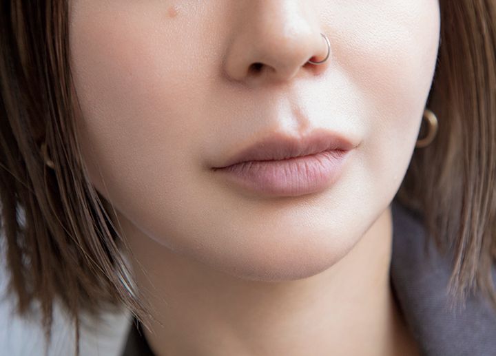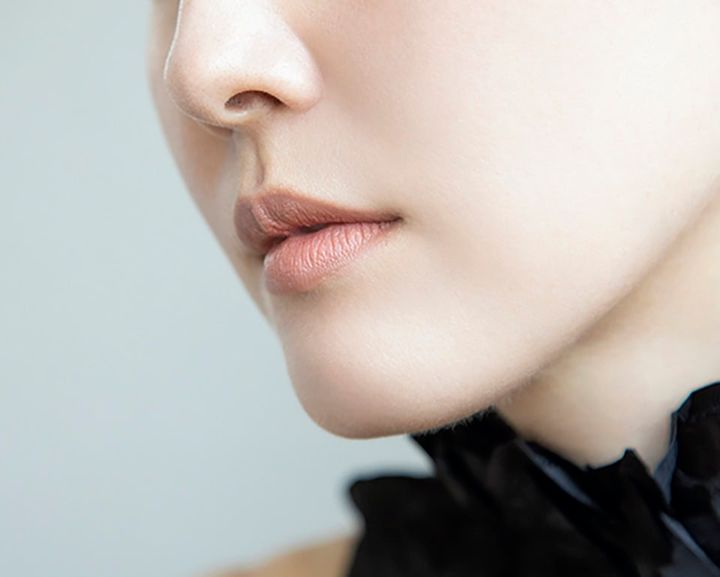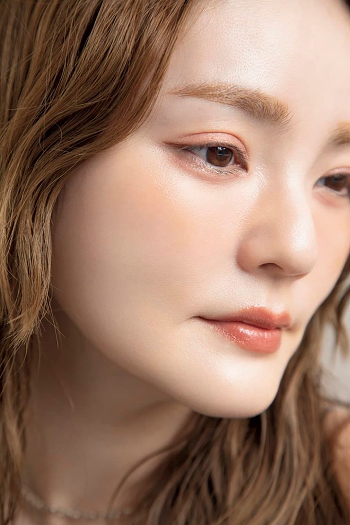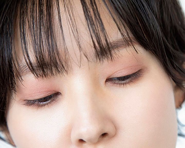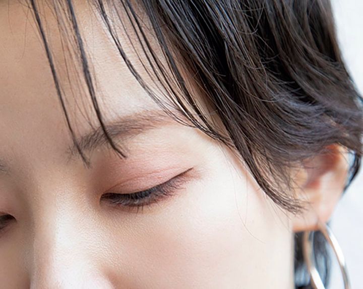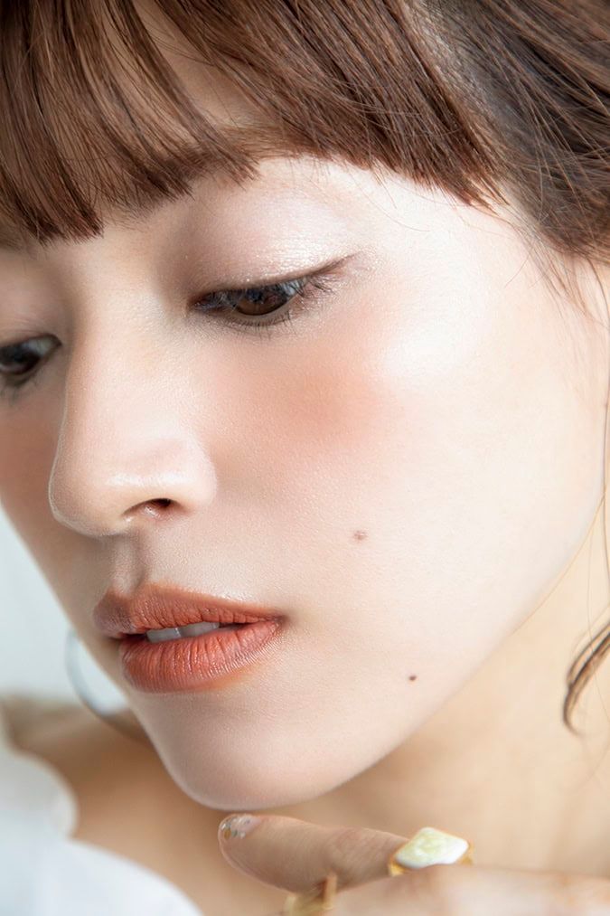 目元が印象的な分、リップはカラーレスなベージュ系でヌケ感を出すのがポイント。目元と口元で緩急をつけることで、よりヌーディで大人っぽいムードを演出できる。