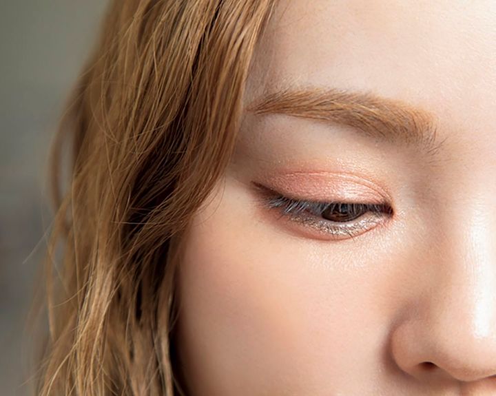 アフター5は目元にほんのり華やぎを。黒だとコントラストが強いので、柔らかなブラウンのアイライナーをセレクト。目尻を少しハネ上げるようにすっと長めにラインを引く。