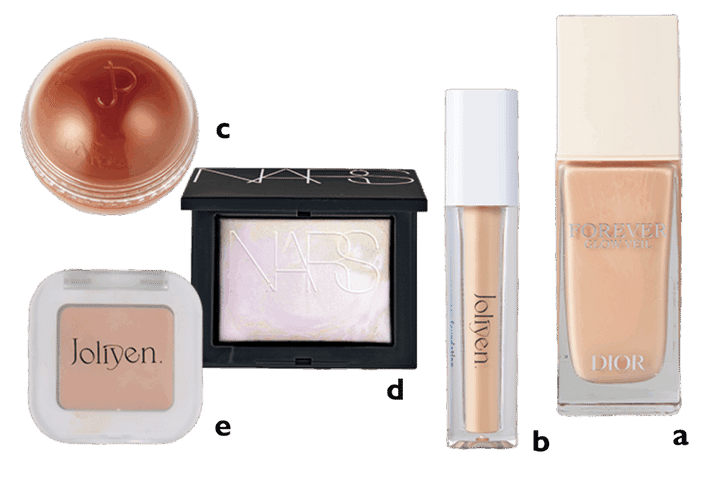 a Diorのディオールスキン フォーエヴァー グロウ ヴェール b Joliyen.のリカバリーファンデーション 01 ライトベージュ c rom&ndのジューシー ロールチーク 05 d NARSのライト リフレクティング プリズマティックパウダー e Joliyen.のアイベースコンシーラーは本人私物